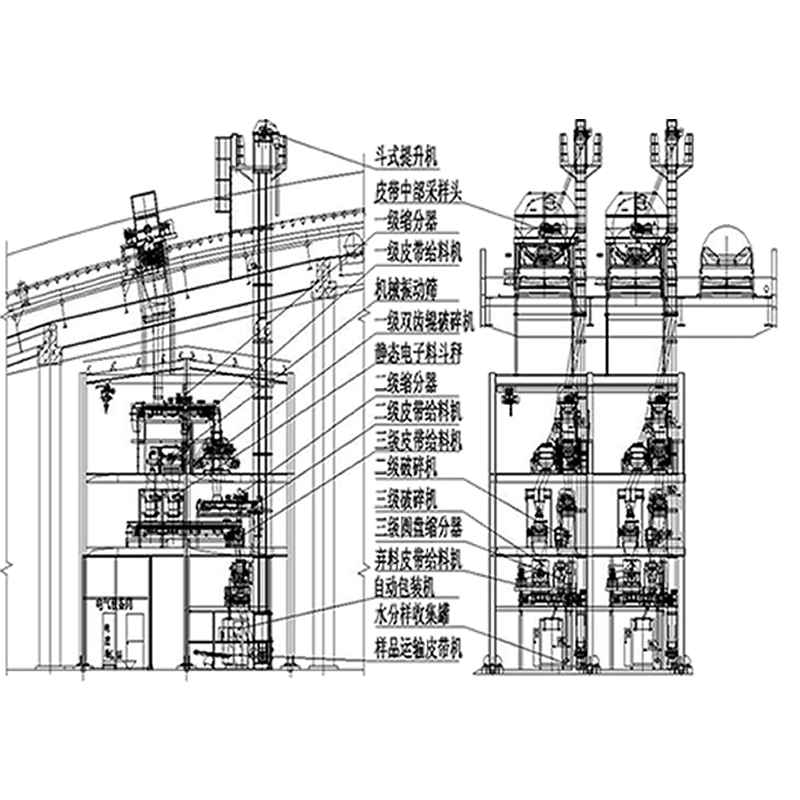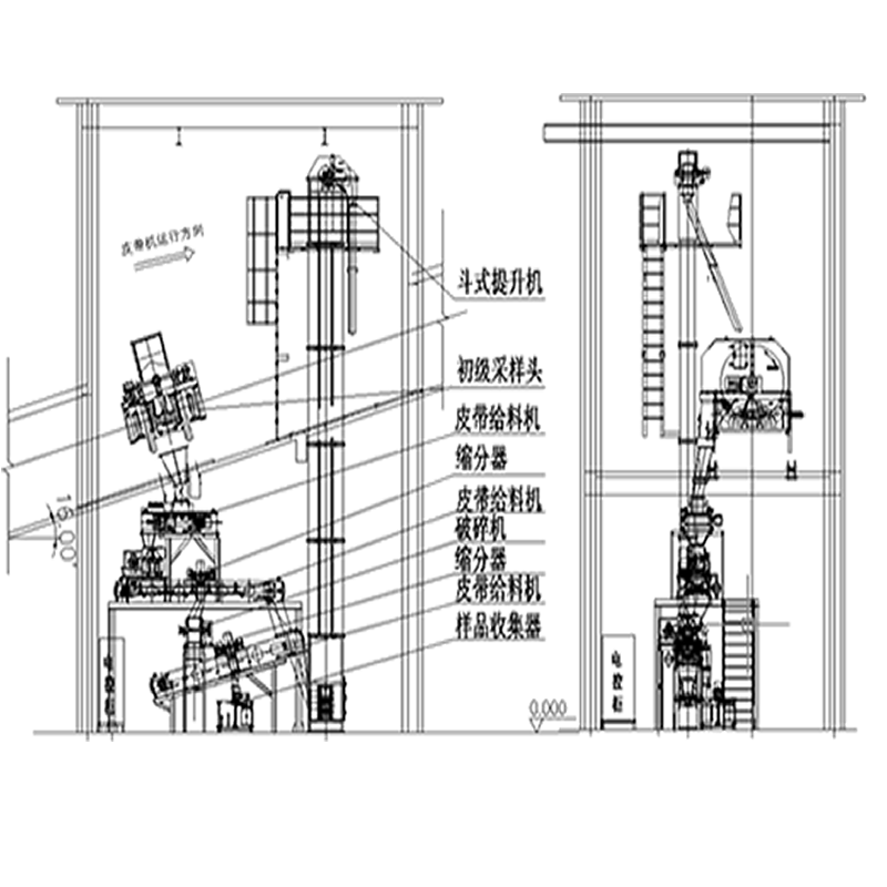 初級采樣頭安裝在皮帶機(jī)頭部落料處,移動斗式頭部采樣頭對物料拋物線截面的物料進(jìn)行全斷面截取,所取物料通過落煤管到初級給料機(jī),進(jìn)入破碎機(jī)、縮分器進(jìn)行破碎縮分,縮分出的樣品經(jīng)落煤管到收集器收集,樣品用于化驗(yàn)室水分樣和成分樣的測定,縮分器的棄料經(jīng)余煤回送裝置或落煤管回到正在運(yùn)行的下級皮帶機(jī)上。