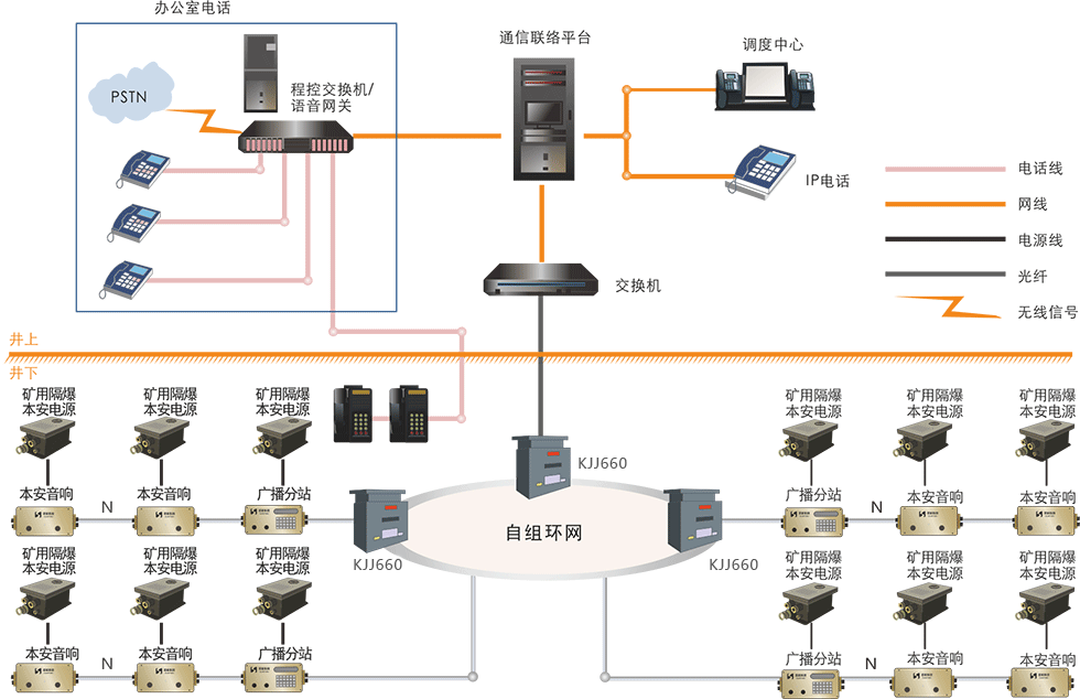 礦用應急救援語音廣播系統(tǒng)是一套基于先進的IPPBX軟交換平臺的廣播調(diào)度系統(tǒng),互通性強,擴展性能好,而傳統(tǒng)的PBX含有各個廠家的專用技術,產(chǎn)品之間互通性、兼容性較差。本系統(tǒng)主要將地面調(diào)度中心的緊急實時廣播、背景音樂和宣傳教育等音頻內(nèi)容廣播到井下大巷、停車場、休息室、采掘工作面等場所,為井下工人提供音樂與安全知識教育以及緊急情況下的安全疏散撤離通知,同時實現(xiàn)生產(chǎn)場所與地面調(diào)度室對講。井下可添加防爆電話,地面融合現(xiàn)有的電話系統(tǒng),接入電話運營商網(wǎng)絡,實現(xiàn)互相撥打的功能。